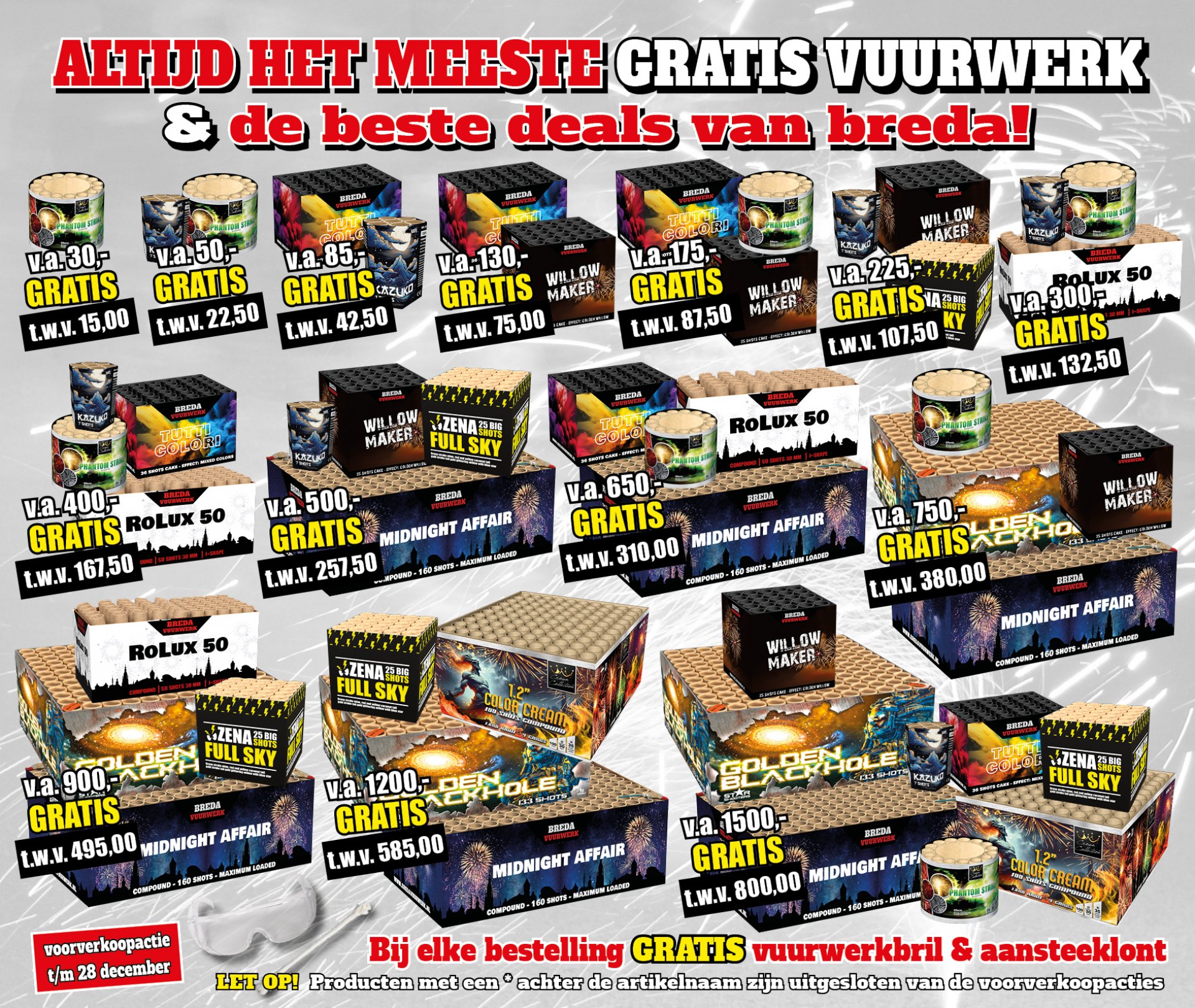 Twee producten voor de prijs van één! De beste vuurwerk acties vind je bij BredaVuurwerk! 1 artikel bestellen is 2 artikelen ontvangen.